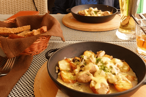 Baked potato in egg is a cozy dish of Russian cuisine that combines simplicity and rich flavor. The potato infused with the aroma of white mushrooms and the tenderness of sour cream-egg sauce becomes soft inside and has an appetizing golden crust outside. This dish likely originated from traditional Russian casseroles where home products were combined into a simple and hearty meal. The slight tang of sour cream adds expressiveness to the flavor while herbs provide freshness. Baked potato in egg is suitable for family dinners as well as cozy evenings with friends. It is served directly in the skillet, keeping it warm and making the presentation especially homely. Delicious, aromatic, and soulfully Russian!