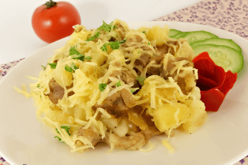 Potatoes with turkey meat and cheese