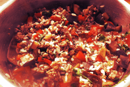 Transfer the minced meat with vegetables to a pot, add the fried eggplants and boiled rice.