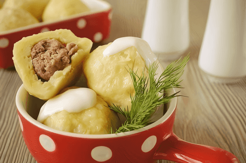 Meat dumplings are a traditional dish of Belarusian cuisine that combines simplicity and heartiness. Historically, they originated in rural homes where potatoes were a staple food. The tender dough made from grated potatoes mixed with flour and eggs creates a soft, velvety texture. Inside is a juicy filling of minced meat that releases the aroma of spices: black pepper, cumin, and onion during cooking. Dumplings are served hot, often with sour cream or fried onions, adding richness to them. This dish is a symbol of home comfort, warming with its taste and aroma. It is perfect for family lunch or dinner, especially in cold weather when something nourishing and warming is desired.