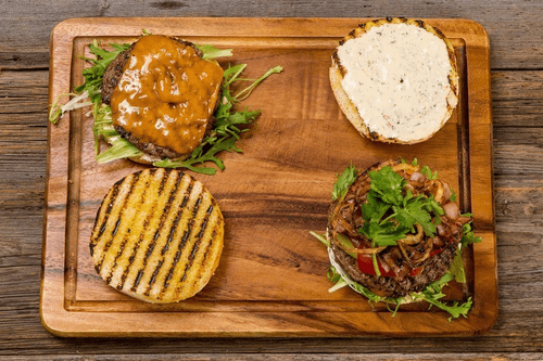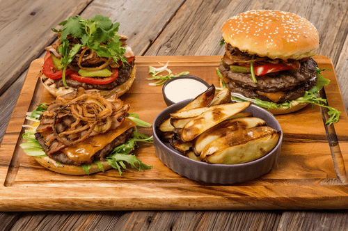 The Chef Burger is an embodiment of American cuisine, combining rich meat flavor, crispy texture, and spicy notes of seasoning. Its history is rooted in fast food culture, but in this recipe it takes on a gourmet character. Two juicy patties grilled to perfection, aromatic bacon, fresh vegetables, and creamy cheddar cheese create a rich flavor bouquet. The burger's highlight is the spicy sauce enriched with garlic paste, anchovies, and lime. Golden-fried onion rings add a crunchy touch while the baked potato side completes the dish. This burger is perfect for a hearty dinner or a friendly gathering, providing delight with every bite.