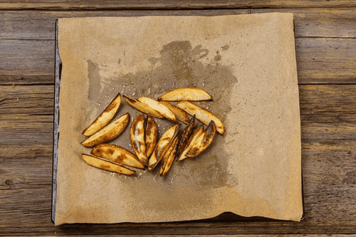Cut the potatoes into wedges, drizzle with olive oil, season with salt and pepper, and bake in a preheated oven at 220 degrees for 20 minutes.