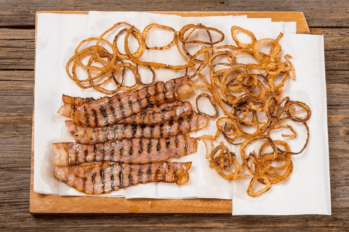 Heat 300 ml of sunflower oil in a saucepan; coat onion rings in flour and fry in the oil in small batches for 4 minutes until golden brown, ensuring the onions don't stick together. Transfer the onions to a paper towel and let them dry completely; fry the bacon on high heat for 30 seconds on each side, transfer to a paper towel, and cut the bacon in half.