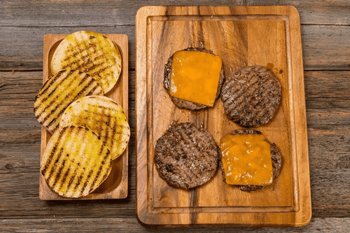 Brush the buns with olive oil and grill on high heat for 30 seconds until black stripes appear, gently pressing the center of the bun; grill 2 patties for 1 minute on each side, generously peppering when flipping; grill the remaining 2 patties on one side in a hot grill pan for 1 minute, flip, pepper, cover with a slice of cheddar cheese, and grill for another minute.