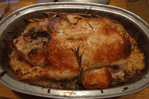 We stuff the carcass with sauerkraut, sliced Antonovka apples, rosemary, and thyme.