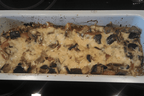 During the frying of onions and mushrooms, the eggplants will release juice; drain them in a colander and rinse off the salt.