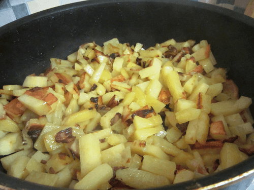 When the potatoes are ready, add the mushrooms and fry for a couple more minutes.