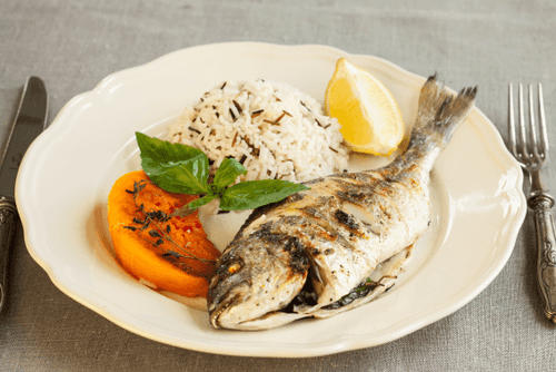 Place the fish on the plate, with boiled rice next to it and baked pumpkin on top. Garnish with lemon and a sprig of basil.