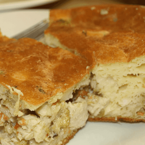 The prototype of this pie is pashtida, a pie made from leftovers, an old Jewish recipe, the main principle of which is frugality. Although in this recipe the filling is prepared from scratch: the chicken is finely chopped and stewed in sour cream with broccoli . But the leftovers from yesterday's dinner can also go inside, this is an excellent option to give a second life to uneaten pilaf, vegetable stew or, for example, a mayonnaise salad - everything will look delicious in the dough. The dough also has spontaneity: it is mixed with sour cream, yogurt and kefir in arbitrary proportions.