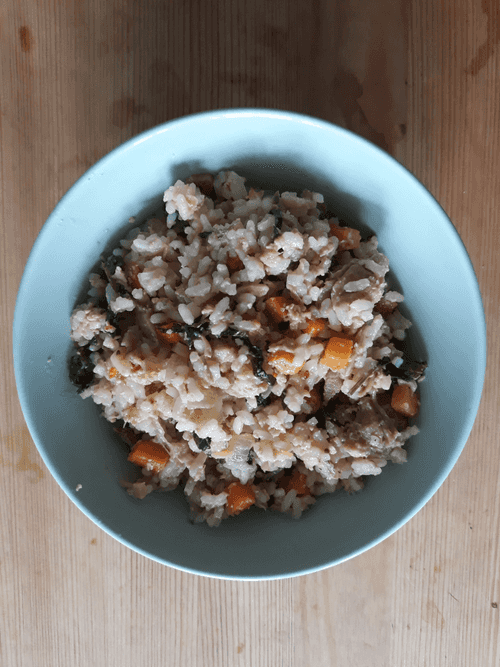 Pour the cooked rice into the pan with our vegetables and tuna. Mix well, remove from heat.