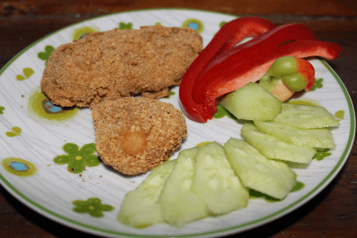 Crush the crackers in a blender or coffee grinder. Coat the chicken 'fingers' in the crackers (you can add sesame or grated almonds to the crackers if desired) and place them on a dry baking sheet lined with foil.