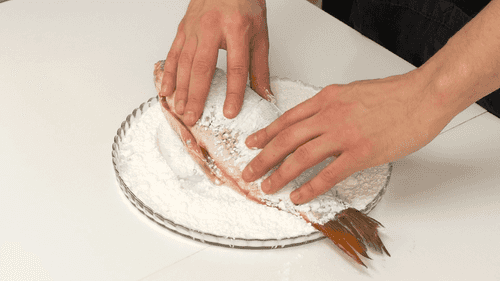 Make 3-4 diagonal cuts on cleaned and gutted carp bodies, rub with salt, then evenly sprinkle with starch on both sides.
