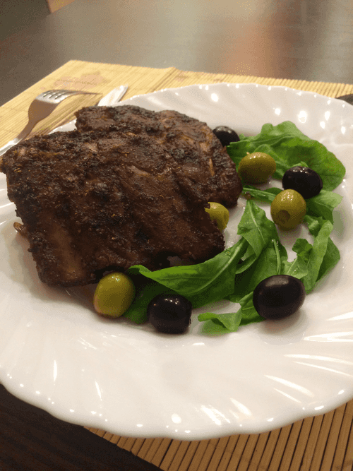 Decorate the ready ribs with vegetable slices. If there are no slices, it's worth making a side dish. I preferred a stew with mushrooms and potatoes.