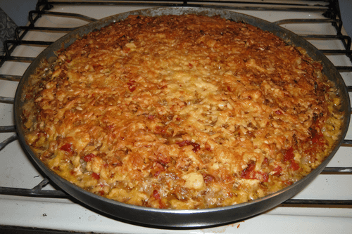 Place in the oven for about 1 hour 20 minutes to 1 hour 30 minutes. Ten minutes before it's done, sprinkle with grated cheese (100-150 g, preferably 'Russian' - melts well) and put back in the oven to melt the cheese.