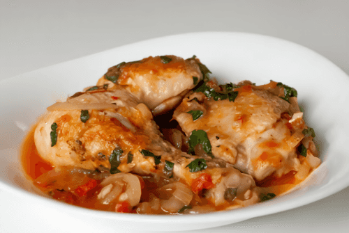 Chicken stewed with vegetables is a tender and aromatic dish popular in European cuisine. Its roots trace back to traditional home recipes where the combination of simple yet rich flavors creates true comfort. Juicy chicken slowly stewed with young zucchini, tomatoes, and onions gains softness and a rich taste, infused with the aroma of fresh herbs and a slight spiciness from bell peppers. The dish is perfect for family dinners as well as festive tables due to its simplicity in preparation and richness of flavor nuances. The side of stewed vegetables makes it balanced and nutritious, while the rich tomato juice adds an appetizing tanginess. It is best served hot, allowing it to rest before serving so that all ingredients can fully express their flavors.