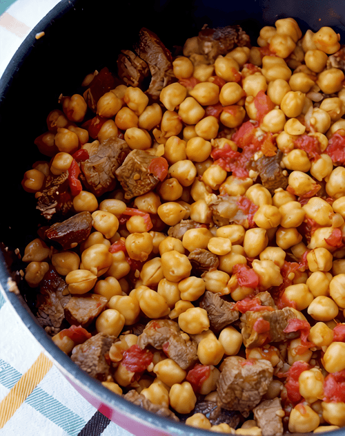 Once the beef is fried, we add chickpeas to it. While stirring constantly, we ensure that the water evaporates. After that, we fry the beef with chickpeas for 5-7 minutes.