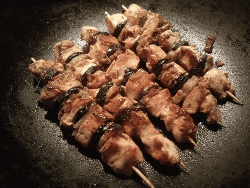 Melt a few pieces of fat in the pan to prevent the skewers from burning. It is advisable to use a non-stick pan.