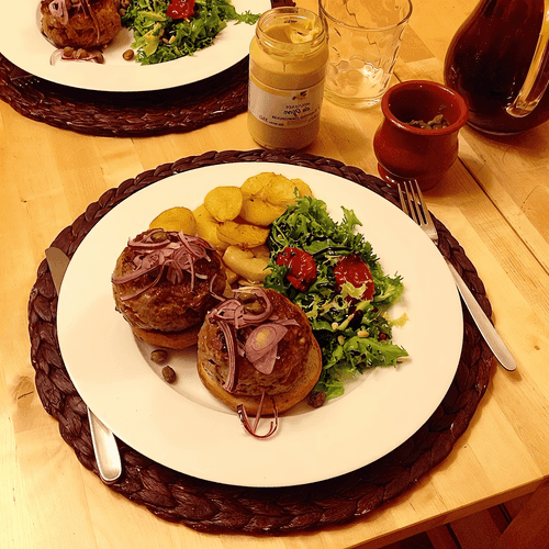 Thinly slice the red onion, lightly salt it and add the marinade from the capers. Let it sit for 10 minutes, then drain the marinade. Add olive oil, pepper, and capers, mix well and place on top of the burgers.