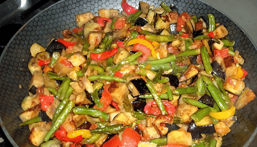 Place the vegetables in a shallow dish, pour with Teriyaki sauce, and let marinate for an hour. Then pour vegetable (sesame or olive) oil into the pan and sauté the vegetables over high heat for 3-4 minutes, stirring. Add sesame seeds, salt, and pepper to taste to the sautéed vegetables in the sauce and mix.