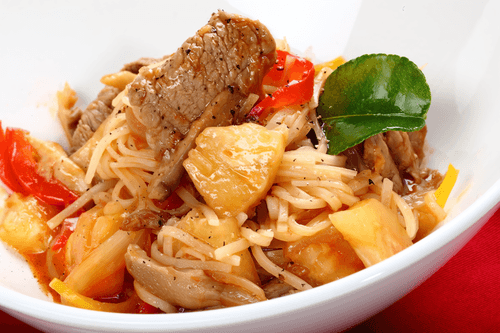 Add meat and rice noodles to the prepared vegetables, mix well, and place on the prepared dish. Enjoy your meal!