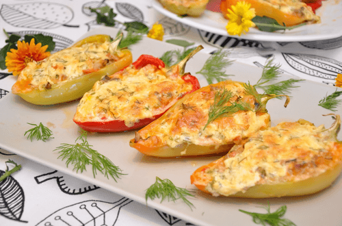 Take out the baking tray and sprinkle the peppers with grated cheese mixed with dill. Put it back in the oven for 10 minutes. Once a golden crust forms on the cheese, the dish is ready.