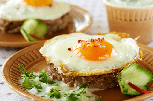 Place the cooked steaks on a plate and top with a fried egg. Serve with cucumber-yogurt sauce. You can serve a grain bun or toast with the steak.