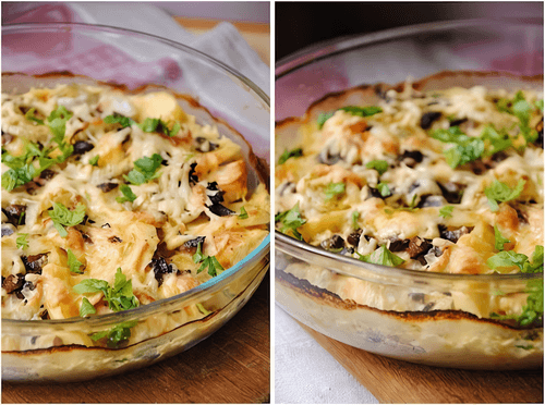 Potato gratin with chicken and mushrooms
