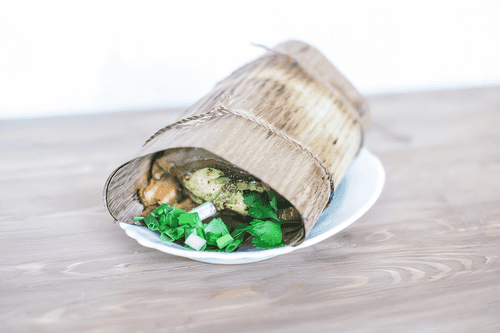 Wrap the food in grill paper and tie the roll with two damp strings. If the edges do not meet, use an additional sheet on top. Place the roll in a preheated pan or baking dish, adding about 1 cm of water to the bottom.