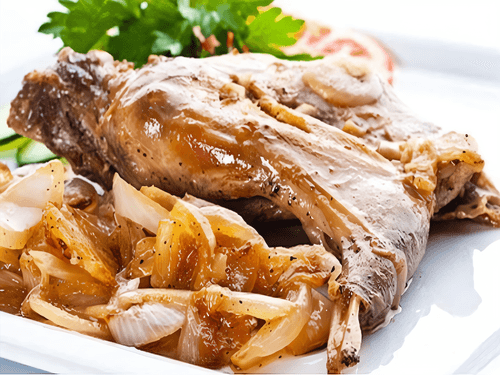 Rabbit stew is a refined dish of European cuisine that combines the tenderness of rabbit meat, the aroma of white wine, and the richness of mushroom sauce. Historically, rabbit meat was valued for its lightness and health benefits, and this recipe embodies the best traditions of French gastronomy. Braised with bacon and vegetables, the rabbit acquires a deep, rich flavor complemented by a slight acidity from the wine. Mushrooms and tomato paste give the sauce a unique texture and richness of taste. This dish is perfect for cozy family dinners or festive events, delighting with a harmonious combination of ingredients. It is served with a side of potatoes or fresh bread that helps to reveal the full palette of flavors in the stew.