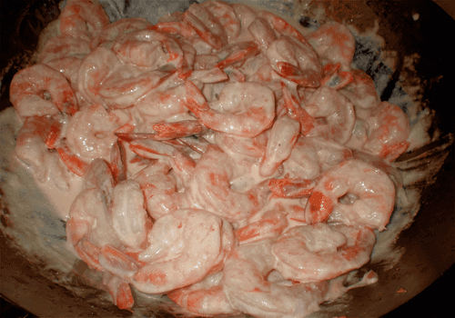 Place the shrimp on a plate and continue to simmer the creamy sauce until it thickens. Then add the shrimp to the thickened sauce.