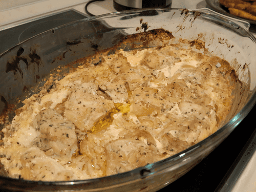 In a large dish, like a duck pot or a pot, mix chicken, onion, garlic, mustard, and olive oil. Add spices and salt to taste. Lay the chicken in an even layer and pour cream over it. Butter can be omitted, but it tastes better with it.