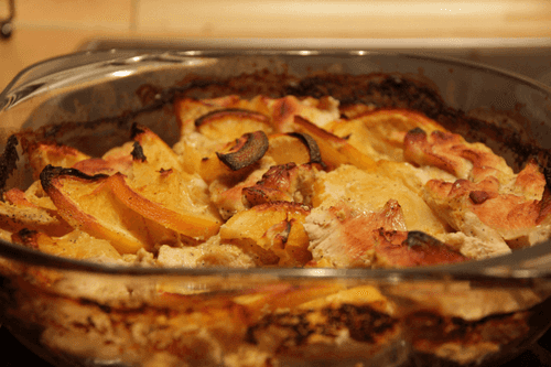 Next, place the chicken in the dish, pour the orange mixture it 'marinated' in, and arrange orange slices between the pieces of meat.