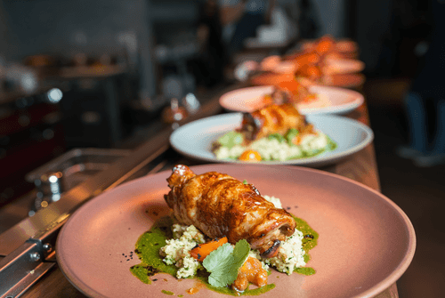 Place pesto on the plate, then couscous, followed by chicken, and garnish with remaining chutney and finely chopped cilantro.