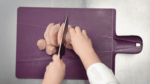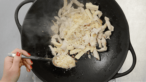 Slice the chicken breast and tofu into thin pieces. Heat oil in a wok. Fry the chicken and tofu over high heat for 5 minutes - until the chicken is browned.