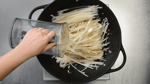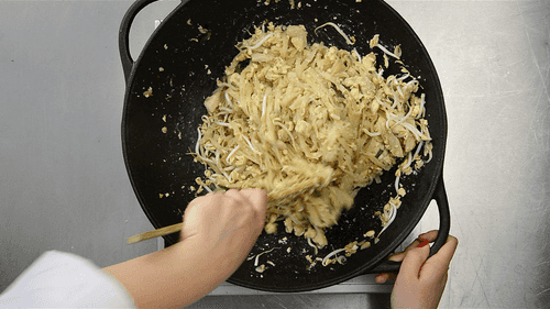 Lightly beat the eggs and pour them into the wok, pushing the noodles to the edge of the pan.