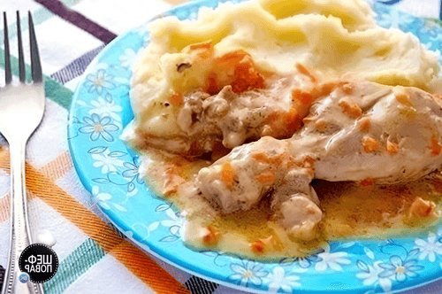 Chicken in creamy sour cream sauce with mushrooms is a tender and aromatic dish of European cuisine that combines the softness of chicken meat, the rich flavor of mushrooms, and the creamy texture of the sauce. The origins of such a recipe can be found in traditional home-cooked meals where sour cream sauce was used to add juiciness and depth of flavor. Chicken stewed with carrots gains a slight sweetness, while mushrooms complement the composition with earthy notes. The milk-sour cream sauce with flour makes the dish velvety and thick, allowing it to pair wonderfully with sides like mashed potatoes, rice, or fresh bread. It is an ideal option for both family dinners and festive gatherings as it is easy to prepare yet has a restaurant-quality taste.