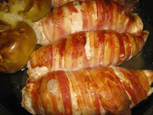 Wrap each chicken breast in two slices of bacon (not too tightly, but enough to hold the chicken).