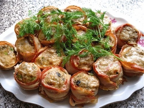 Mushroom-stuffed meat roll-ups baked in bacon are a true gastronomic delight that combines the juiciness of minced meat, the aroma of mushrooms, and the spiciness of smoked bacon. This recipe originates from Russian cuisine, where the combination of simple yet rich flavors is traditionally valued. Thanks to spices and herbs, the meat base gains brightness while the bacon becomes crispy during baking, infusing the filling with its rich aroma. The mushroom filling adds tenderness and depth of flavor. These roll-ups are perfect for festive gatherings as well as cozy family dinners. They can be served with mashed potatoes, fresh vegetables, or savory sauces to create a harmonious dish rich in taste and texture.