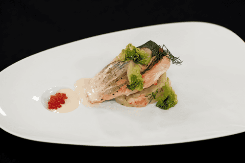 Salmon steak on baked potatoes with caviar sauce