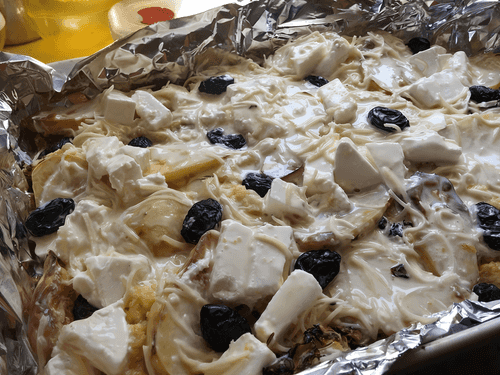 Mix 250 g of cream, 3 eggs, and 100 g of grated cheese, pour into a dish and bake in the oven for about 15 minutes until golden.