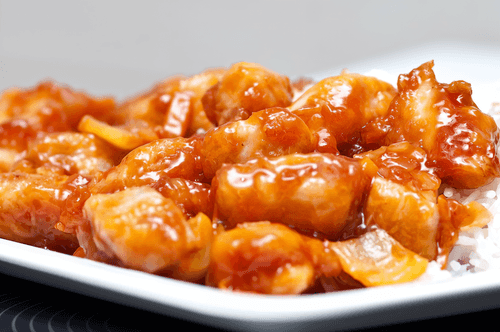 Chicken in sweet and sour sauce with sweet pepper and pineapple