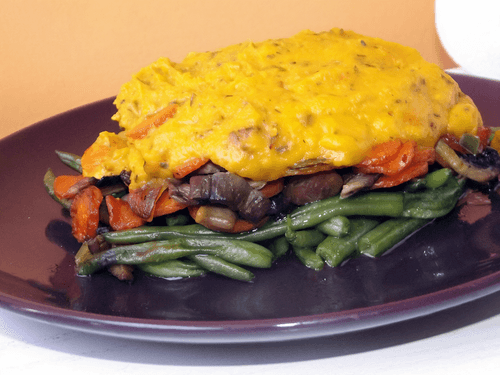 Layer beans, carrots, and mushrooms on a plate, and drizzle with sauce.