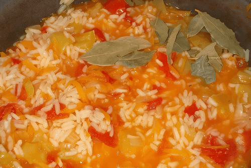 Add pepper, rice, tomatoes, water, and salt to the pan with onions.