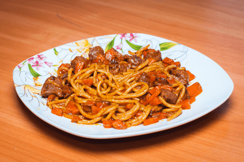 Spaghetti with pork in a spicy sauce is a dish with a rich aroma and deep flavor, harmoniously combining the sweetness of carrots, the spiciness of paprika, and the tenderness of pork soaked in soy sauce. European culinary traditions love a balance of flavors, and this recipe perfectly conveys the play of spicy and rich tones. A hint of cinnamon adds sophistication, while tomato paste gives a pleasant tang. The dish is easy to prepare but looks worthy of a festive dinner. The spaghetti absorbs the sauce, gaining juiciness and richness. This dish is suitable for a cozy family dinner or impressing guests with its unusual blend of spices. Try it – and it will surely find a place in your collection of favorite recipes!