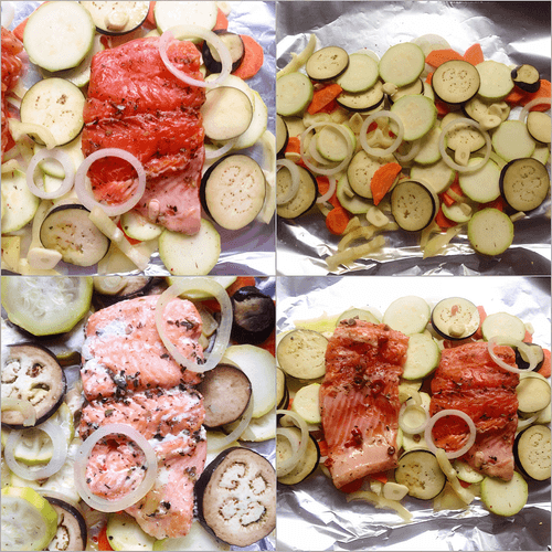 Trout baked in foil with seasonal vegetables
