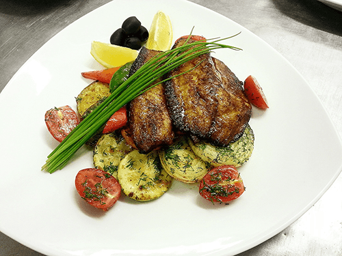 While the fish is baking, we sauté the vegetables in butter on both sides, season with salt and pepper, and add cherry tomatoes and dill.