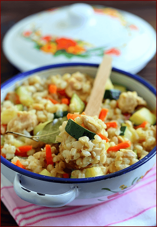 Add frozen vegetable mix to the meat and cook, stirring for 1-2 minutes. Add boiled pearl barley and mix. Reduce heat to minimum, cover, and cook for another 2 minutes.