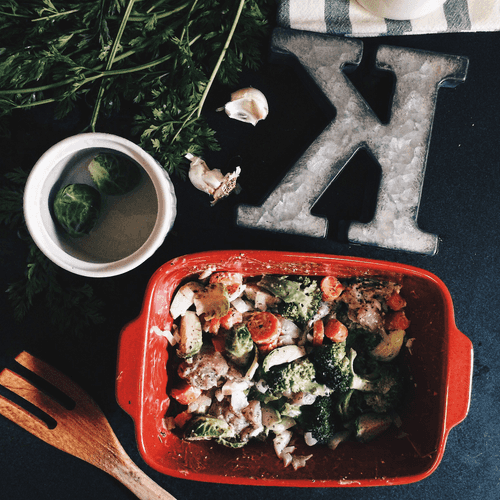 Chicken baked with broccoli, brussels sprouts, carrots and parmesan
