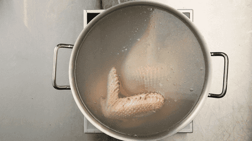 Place the turkey in a deep pot and cover with water. Boil, remove, and cool.