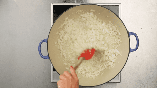 Remove fat from the broth, sauté finely chopped onion in a deep pan or pot. Strain the remaining broth and let it cool slightly.